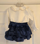 "Dulce Blue" Blouse and Bloomers Set by Portuguese Designer Puro Mimo. This expert-designed blouse and Bloomers Set features soft velvet fabric that ensures comfort and warmth. The blouse is accented with a delicate lace collar, perfectly complementing the Navy frilled bloomers for a harmonious ensemble. Ideal for special occasions or everyday wear, this coordinated set balances elegance and playful charm in your child’s wardrobe.