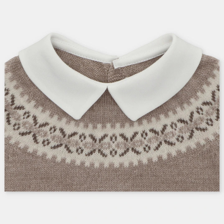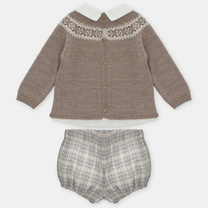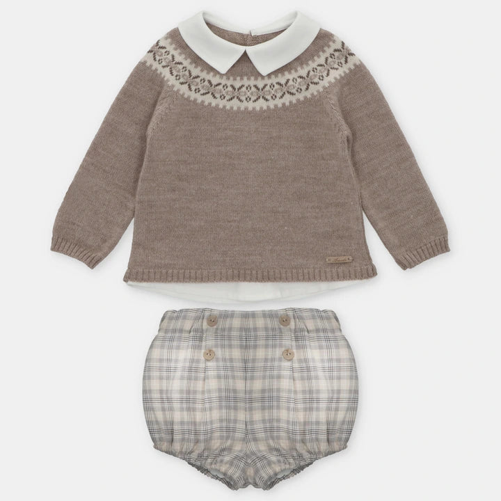 Beige Fair Isle Jumper and Shorts by Spanish designer Martin Aranda. This Beige Fair Isle Jumper and Shorts set by renowned Spanish designer Martin Aranda offers timeless knitwear sophistication for children. Crafted with a classic Fair Isle pattern in neutral beige tones, it balances traditional charm with modern comfort. Ideal for cooler days, the jumper provides warmth while the matching shorts ensure ease of movement. This duo combines quality craftsmanship with stylish versatility, perfect for elevating your child’s seasonal wardrobe.