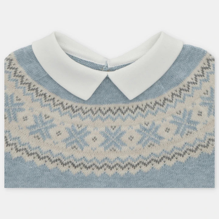 The Sky Fair Isle Jumper and Shorts set by Spanish designer Martin Aranda combines classic patterns with modern comfort. The jumper features a traditional Fair Isle design, offering warmth and timeless style, while the velour shorts provide softness and flexibility with an elasticated waist and leg openings for an easy fit. This coordinated set delivers both sophistication and practicality, perfect for stylish yet comfortable children’s wear..